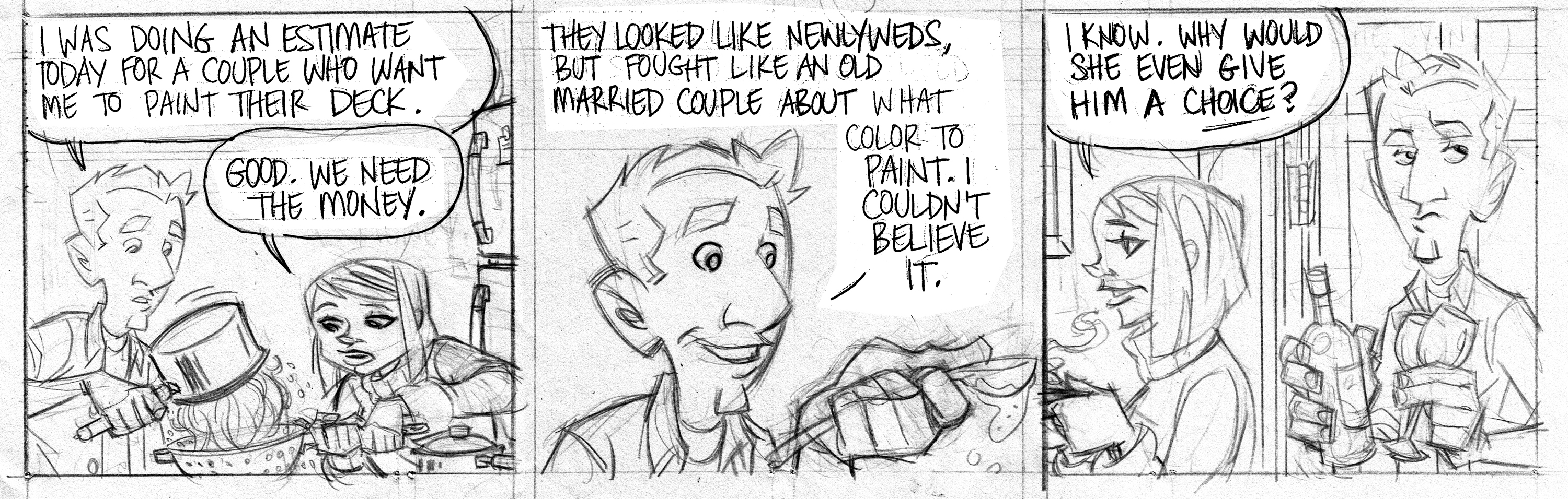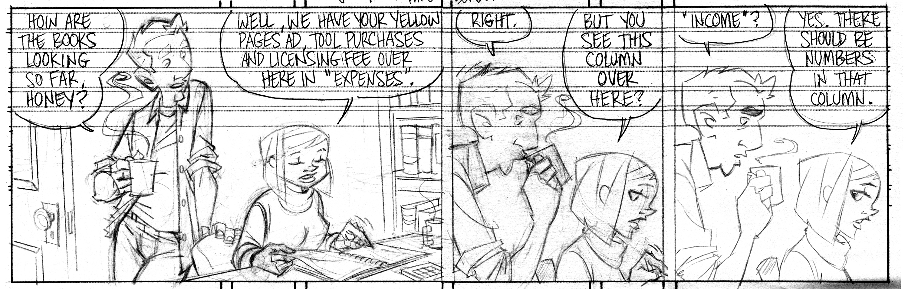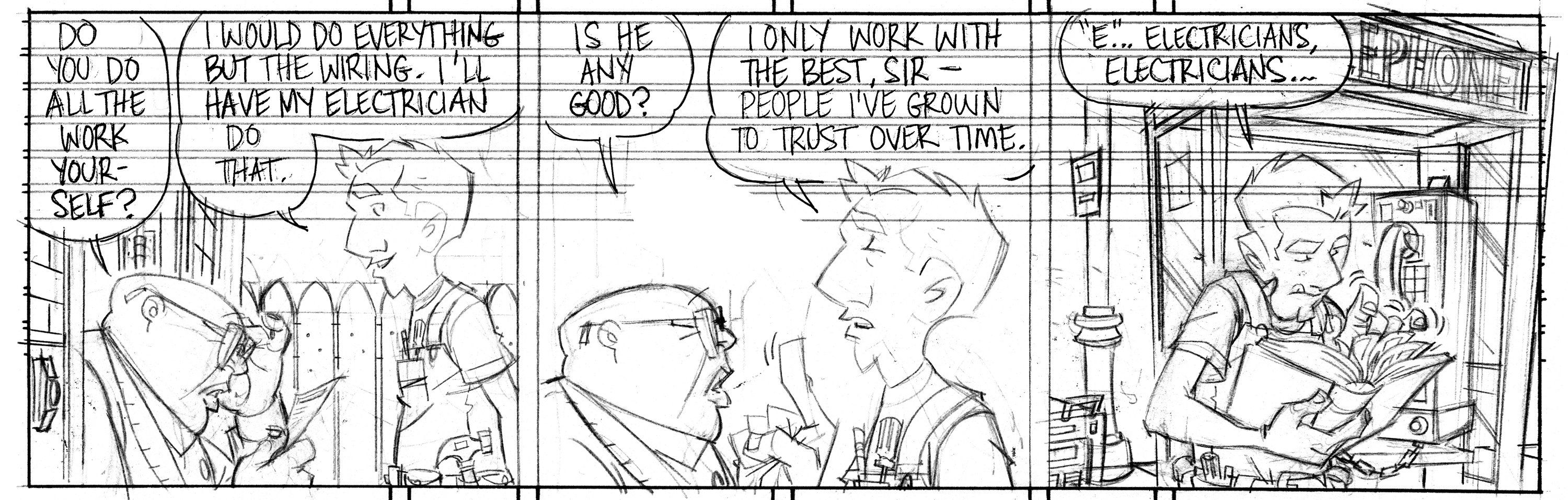 This is the way we’re going to roll with these – straight outta the sketchbook style. These strips were never inked and have never before seen the light of day. I think it’s interesting to see them this way and gives us a peek into Tim’s raw drawing talent. But remember – same characters, new situation. James is trying to make it as a new Contractor.